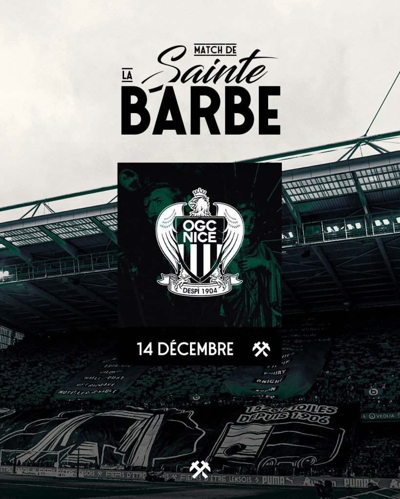 Dans la pure tradition du bassin minier, le Racing célébrera la Sainte Barbe à l’occasion de sa première réception du mois de décembre. Cette saison, les festivités auront lieu lors de RC Lens – OGC Nice le 14 Décembre .