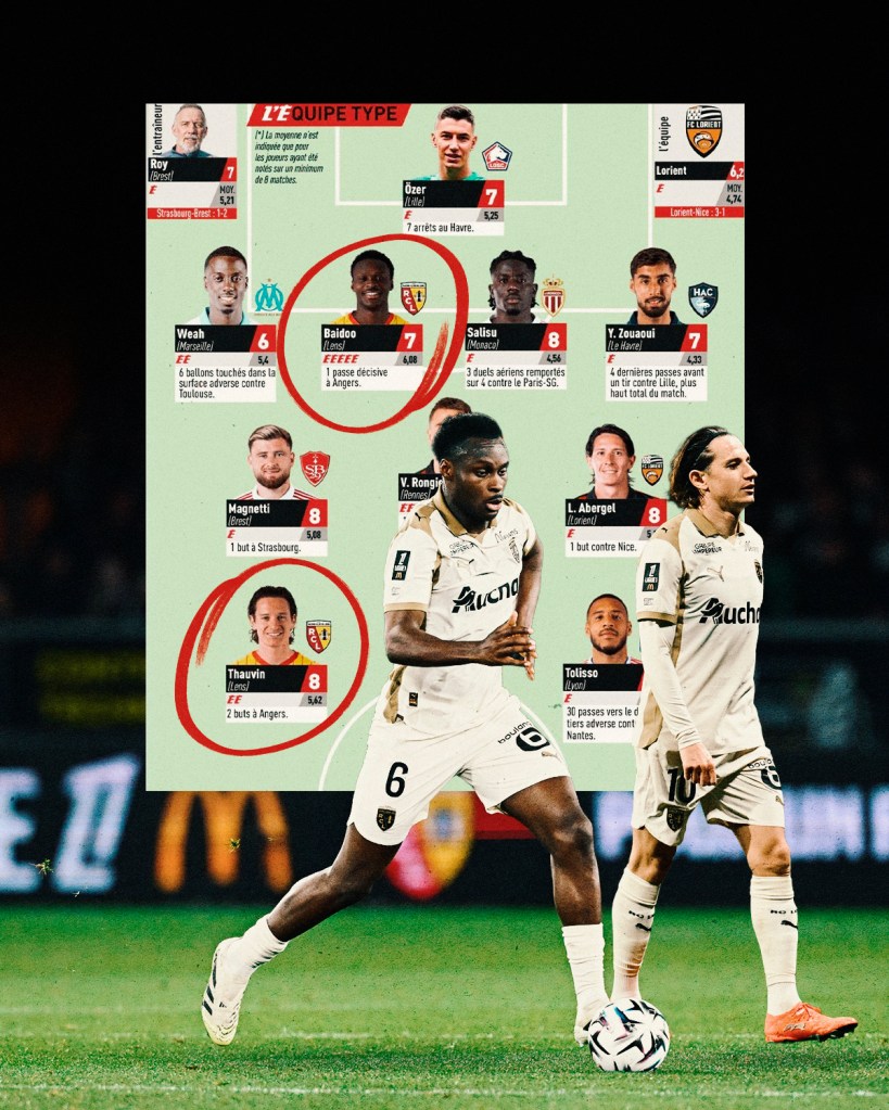 Présent pour la cinquième fois cette saison dans le onze du week-end du quotidien L’Équipe Samson Baidoo – noté 𝟕/𝟏𝟎 – accompagne Florain Thauvin double buteur lors de SCO Angers – RC Lens qui hérite de la note de 𝟖/𝟏𝟎.