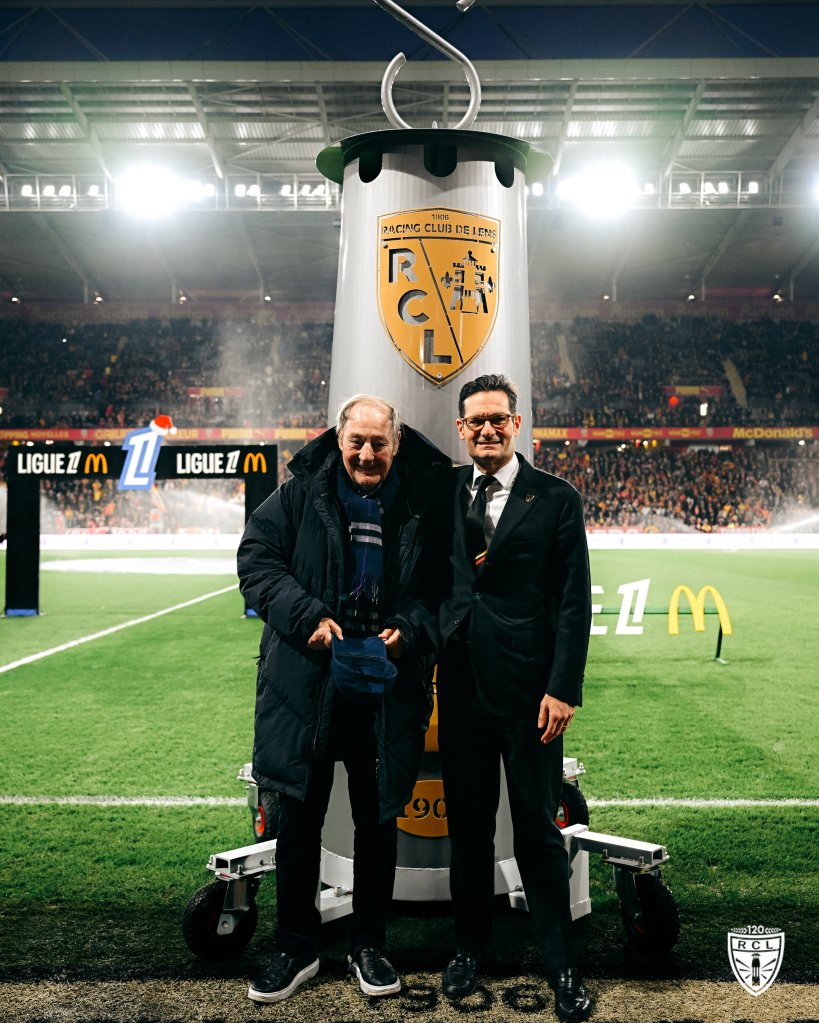 En prĂ©ambule de RC Lens – OGC Nice le PrĂ©sident Joseph Oughourlian et Gervais Martel ont dĂ©voilĂ© une lampe de mineur gĂ©ante qui sera prĂ©sente lors de chaque rencontre Ă Bollaert, intĂ©grant le patrimoine du club.
