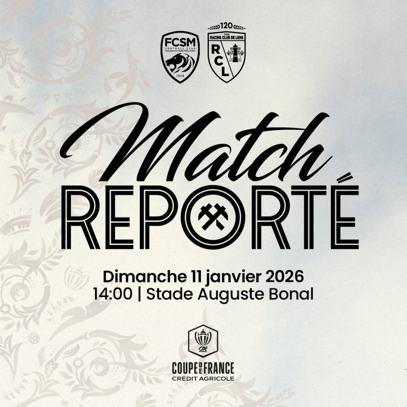Le Racing Club de Lens informe que la rencontre FC Sochaux-MontbĂ©liard â RC Lens, comptant pour les 16es de finale de la Coupe de France, initialement programmĂ©e ce jour, est reportĂ©e Ă demain Ă 14 heures. Alors que la rencontre aurait pu se disputer ce soir Ă huis clos, les deux clubs, animĂ©s par lâesprit et les valeurs de la Coupe de France, ont conjointement acceptĂ© ce report afin de se donner une chance supplĂ©mentaire de pouvoir accueillir du public dans les tribunes. Toutefois, au regard des incertitudes mĂ©tĂ©orologiques persistantes, et alors que les autoritĂ©s compĂ©tentes statueront demain sur la possibilitĂ© ou non dâaccueillir du public, le Racing Club de Lens, dans un souci de respect et de principe de prĂ©caution Ă lâĂ©gard de ses supporters, invite lâensemble de ses sympathisants Ă renoncer Ă ce dĂ©placement. Cette recommandation relĂšve de la responsabilitĂ© du club, soucieux de la sĂ©curitĂ© de ses supporters dans un contexte encore incertain. Le club remercie ses supporters pour leur comprĂ©hension et leur fidĂ©litĂ© indĂ©fectible.