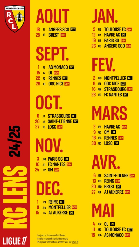 La LFP vient de communiquer le calendrier complet pour le RC Lens . Le voici