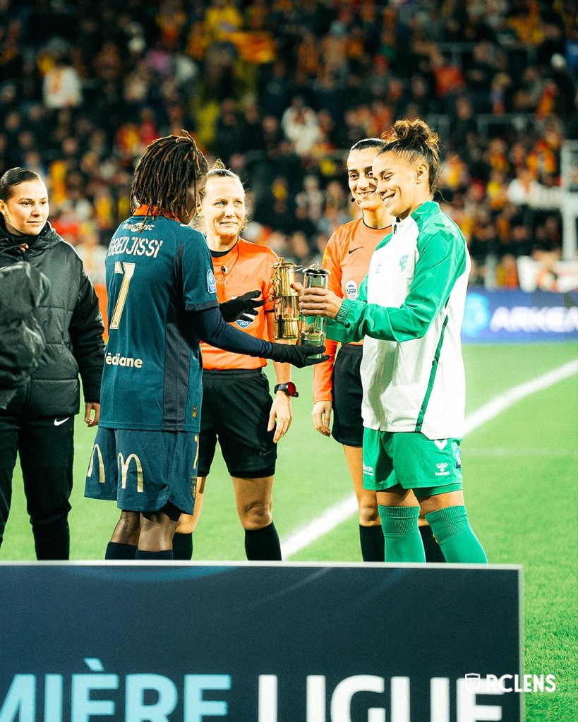 Avant RC Lens Féminin – ASSE Féminin à Bollaert-Delelis, les capitaines des deux équipes ont procédé à un échange de lampes de mineur, signe de respect entre le Racing et l’ASSE Féminines clubs au passé minier commun.